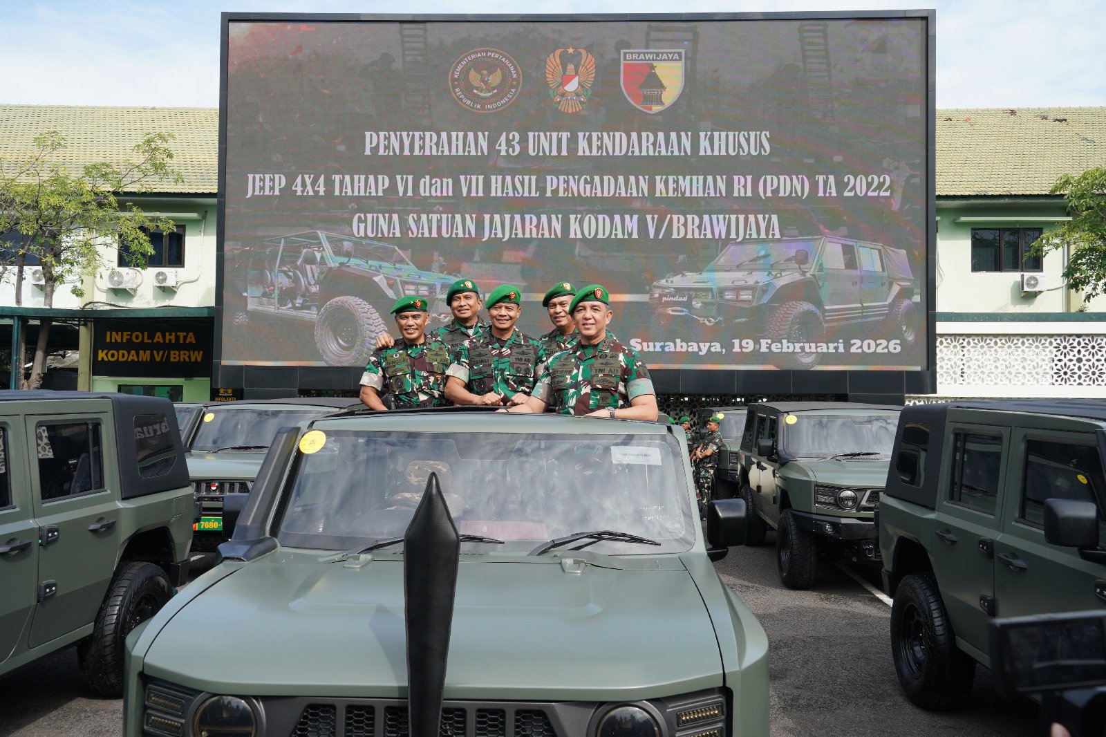 Lpk | Surabaya – Danrem 084/Bhaskara Jaya Brigjen TNI Danny Alkadrie menghadiri acara penyerahan 43 unit kendaraan khusus (Ransus) Jeep 4×4, sebagai upaya penguatan kesiapsiagaan satuan jajaran Tentara Nasional Indonesia Angkatan Darat (TNI AD). Kegiatan berlangsung di Lapangan Apel A. Yani Makodam V/Brawijaya, Sawunggaling, Kecamatan Wonokromo, pada Kamis (19/02).